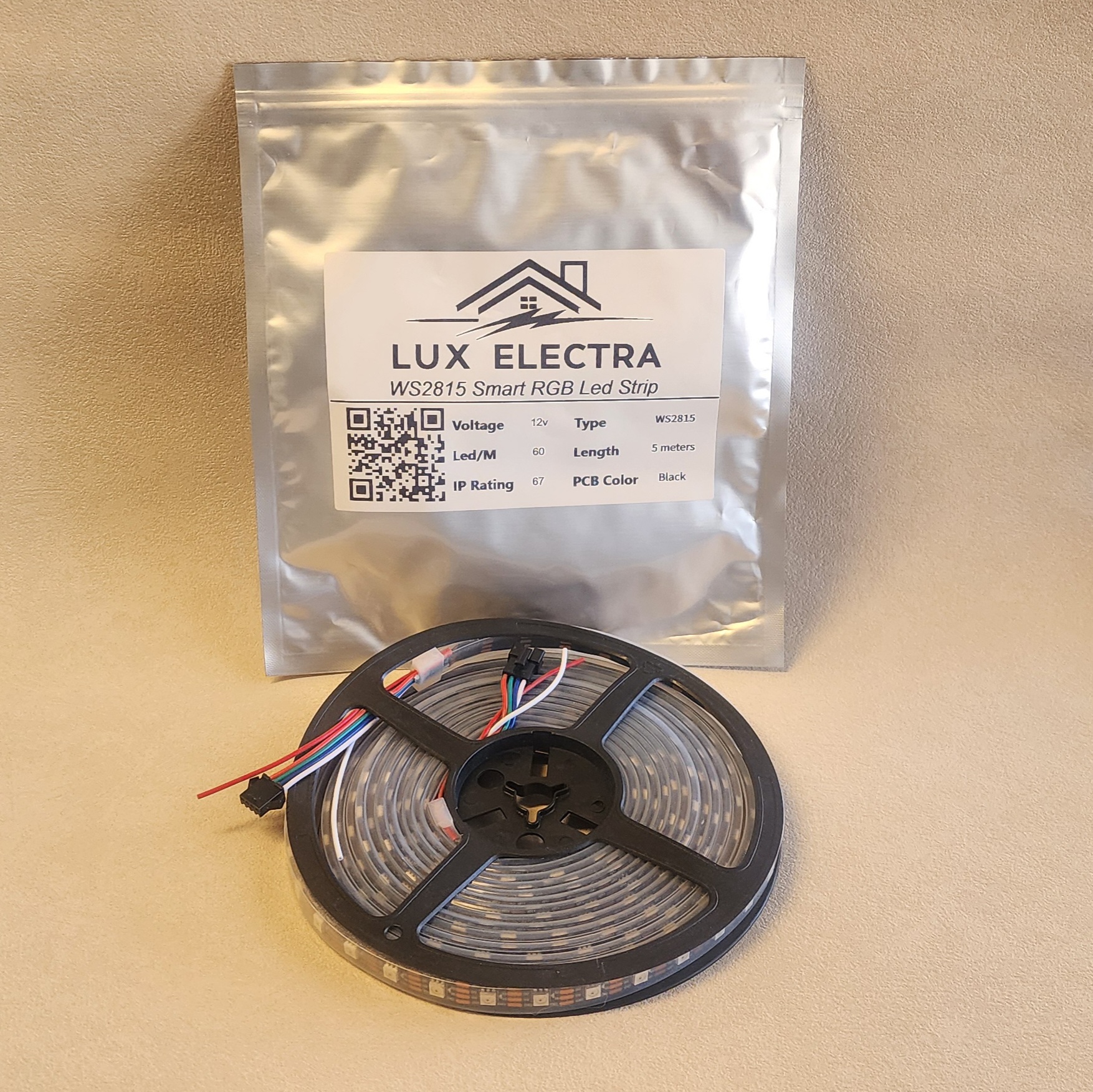 The Lux Electra WS2815 is a professional-grade addressable RGB LED strip designed for creators, makers, and homeowners who demand more than basic lighting. Each of the 300 LEDs on this 5-meter reel can be individually controlled — meaning you can run smooth rainbow chases, reactive music effects, ambient color fades, and custom pixel animations that standard RGB strips simply cannot do.